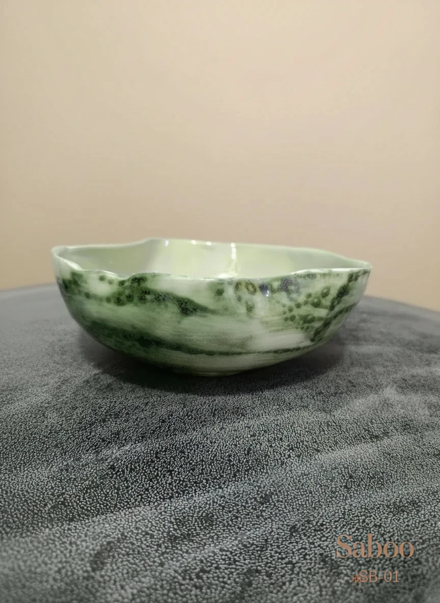 کاسهی سرامیکی دستساز با لبههای موجدار، الهامگرفته از فرمهای ارگانیک طبیعت. سطح داخلی با لعاب سبز پاستیلی(ماچا) براق پوشانده شده و بیرون کار با طیف سبز عمیق و افکتهای لکهای–جریانی تزئین شده است.این کاسه در کوره دمای بالا پخته شده و لعاب آن کاملاً پایدار، بهداشتی و مناسب استفاده روزمره است. بافت موجی و لبههای نامنظم، حس کاملاً دستساز و منحصربهفرد بودن را در هر قطعه تقویت میکند.مناسب برای سرو سالاد، نودل، ماستوخیار، میوه، تزئین میز و دکور آشپزخانه.